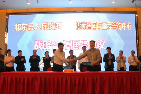最后,公司黨委副書記、總經(jīng)理詹瓊雷,祁東縣委常委、常務(wù)副縣長雷建軍,分別代表湖南省國際工程咨詢中心有限公司和祁東縣人民政府在戰(zhàn)略合作框架協(xié)議書上簽字。