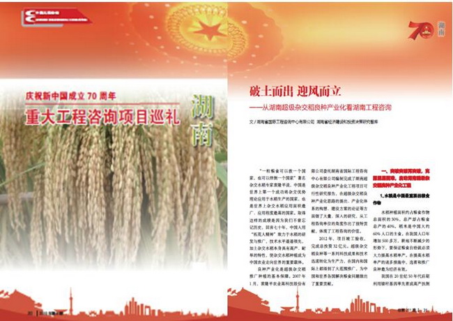 省咨詢公司完成的《湖南超級雜交稻良種產(chǎn)業(yè)化工程可行性研究報告》作為湖南唯一申報的工程咨詢成果,參展了中國工程咨詢協(xié)會“慶祝新中國成立70周年重大工程咨詢項目巡禮”,在《中國工程咨詢》雜志上刊登展示。公司工程咨詢成果獲此殊榮,體現(xiàn)了公司咨詢成果的品質(zhì)和質(zhì)量達(dá)到了一流水平,得到了國家和湖南省工程咨詢行業(yè)的高度關(guān)注和廣泛認(rèn)可。