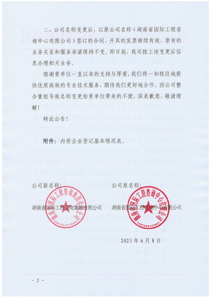 二、公司名稱變更后,以原公司名稱(湖南省國際工程咨詢中心有限公司)簽訂的合同、開具的發(fā)票繼續(xù)有效,原有的業(yè)務關系和服務承諾保持不變。即日起,我司按上述變更后信息辦理相關業(yè)務。