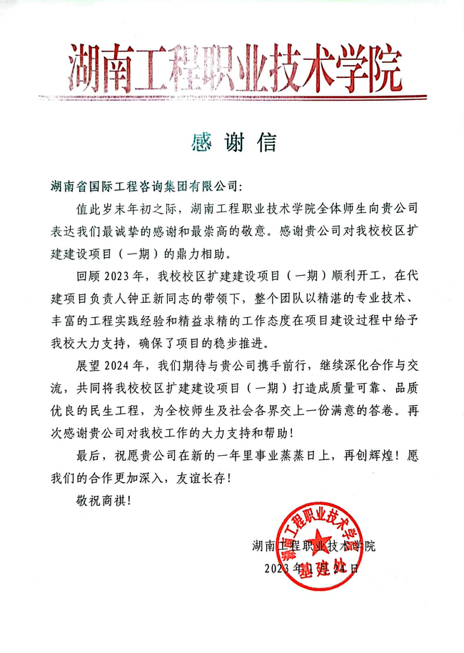 近日,湘咨集團收到來自湖南省發(fā)展改革委、湖南工程職業(yè)技術(shù)學(xué)院發(fā)來的感謝信。信中對集團代建項目經(jīng)理鐘正新同志及代建管理團隊在該校校區(qū)擴建建設(shè)項目(一期)代建管理方面的專業(yè)、務(wù)實、高效給予高度贊譽,對投融資與戰(zhàn)略咨詢事業(yè)部蔡丹丹同志積極協(xié)助配合美麗中國評估組在湘聯(lián)絡(luò)協(xié)調(diào)、開展環(huán)境基礎(chǔ)設(shè)施摸底調(diào)查等工作給予充分肯定。