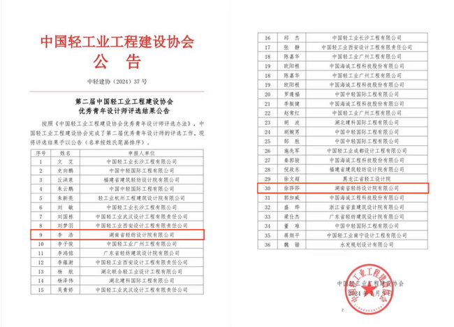 近日,中國輕工業(yè)工程建設協(xié)會正式公布了“第二屆中國輕工業(yè)工程建設協(xié)會優(yōu)秀青年設計師”評選結果,湘咨集團所屬省輕紡院李浩、徐莎莎2名專家榮獲“第二屆中國輕工業(yè)工程建設協(xié)會優(yōu)秀青年設計師”榮譽稱號。