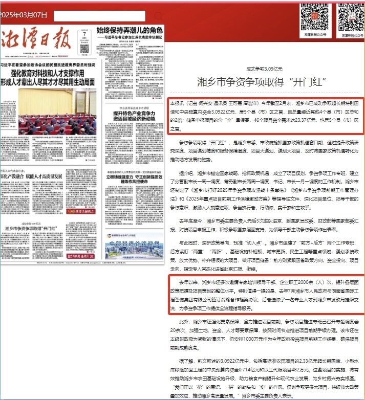2025年3月6日,據(jù)湘潭日?qǐng)?bào)報(bào)道,截至2月末,湘鄉(xiāng)市成功爭(zhēng)取超長(zhǎng)期國(guó)債和中央預(yù)算內(nèi)資金3.092億元,儲(chǔ)備項(xiàng)目資金需求23.37億元,兩項(xiàng)指標(biāo)領(lǐng)跑湘潭市縣區(qū)?!ぁぁぁぁぁ?/p>