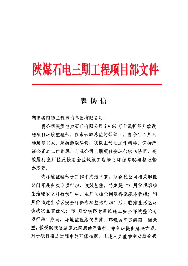 近日,由湘咨集團(tuán)環(huán)境保護(hù)咨詢事業(yè)部承接的陜煤石門電廠三期環(huán)境監(jiān)理項(xiàng)目收到建設(shè)單位發(fā)來的表揚(yáng)信,來信對集團(tuán)監(jiān)理人員在項(xiàng)目建設(shè)階段的辛勤付出和卓越表現(xiàn)表示由衷······